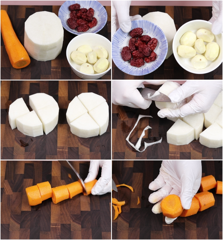 무2토막(350g). 당근1/2개. 밤6개. 대추10개 .청양고추5개