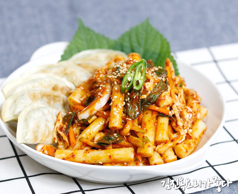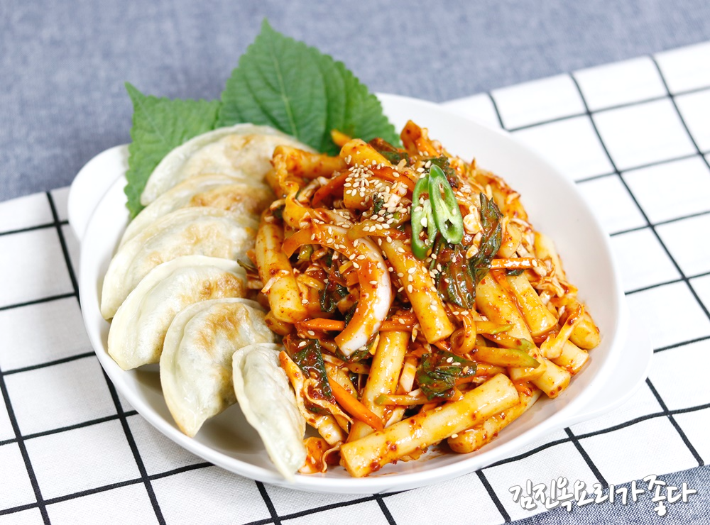 *주재료(4인분):떡볶이떡400g.군만두8개.양배추200g.오이1/2개.깻잎10장.양파1/4개.
