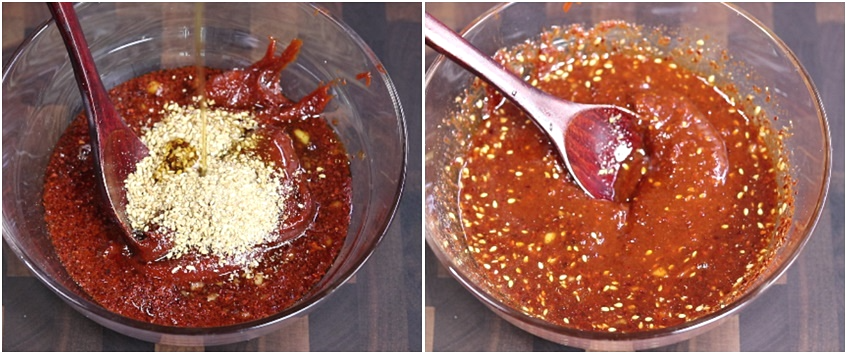고추장3T.고춧가루2T.간장2T반.다진마늘1/2T.식초5T반~6T.올리고당2T.설탕1T.참기름1T반.깨1T반를 넣고 섞어 양념장을 만들어줍니다.