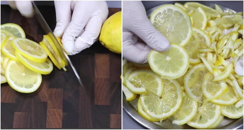 6. 레몬4개(500g)은 슬라이스해준후 레몬씨는 제거합니다.