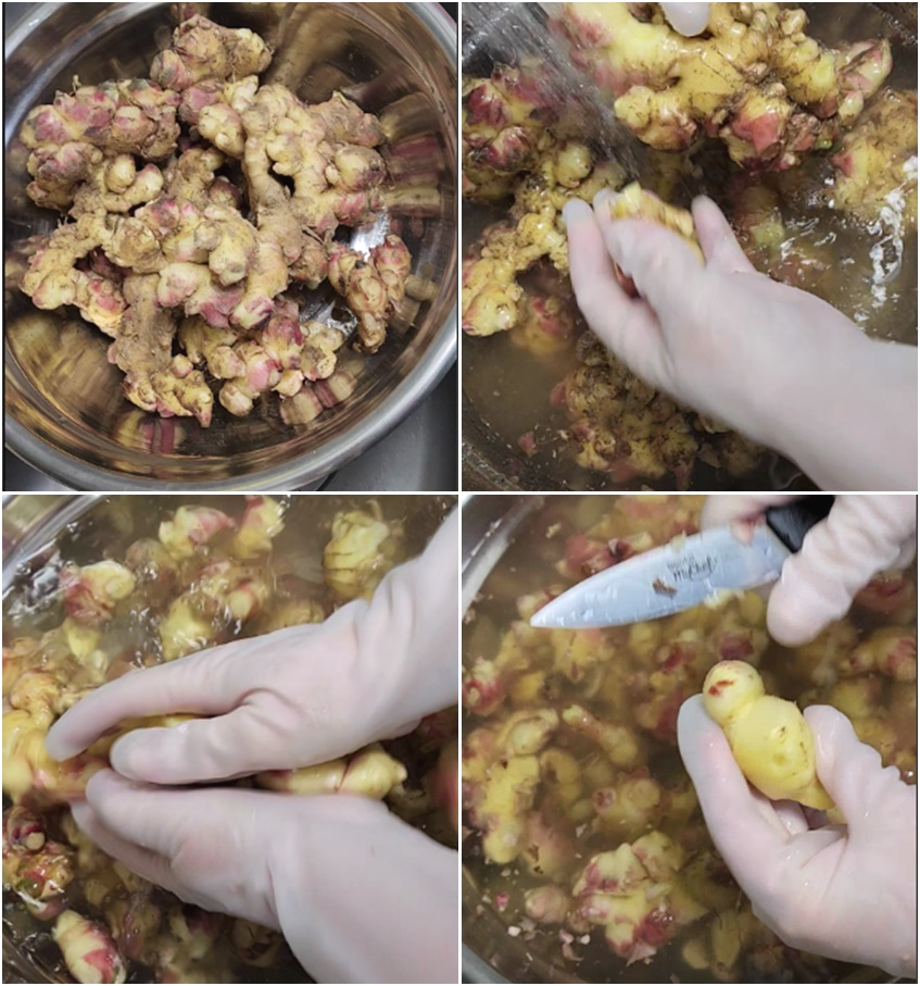 1.햇생강을 구입후 손질합니다. 물에 담궜다가 고무장갑낀 손으로 팍팍 문질러준후 생강틈에 있는 흙은 칼로 긁어서 제거합니다.