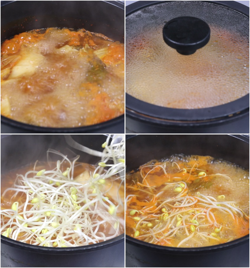 2. 뚜껑은 덮고요 센불에서 끓으면 중불로 줄여 5분 끓인후 세척한 콩나물150g을 넣고요~ 뚜껑은 열고 센불로 켜줍니다.