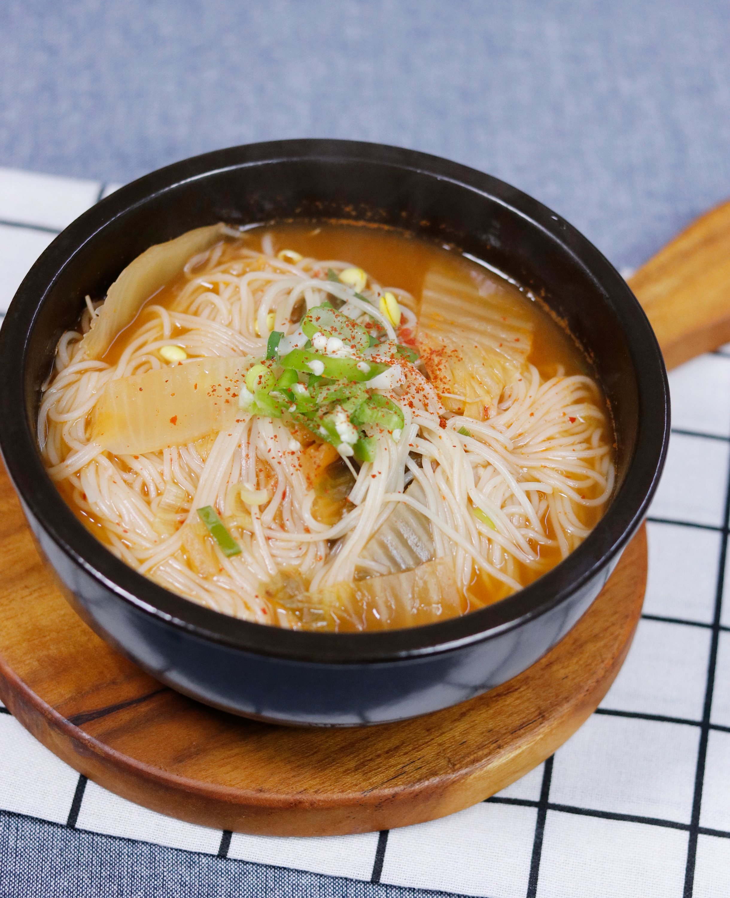 재료(2인분):잘익은배추김치300g.멸치다시마육수800ml.물900ml.김칫국물5T.국간장2T.멸치액젓1T.다진마늘1/3T.콩나물150g.소면180g.다진파3T.소금소량(완두콩알만큼).설탕아주소량(신맛이 강할때).