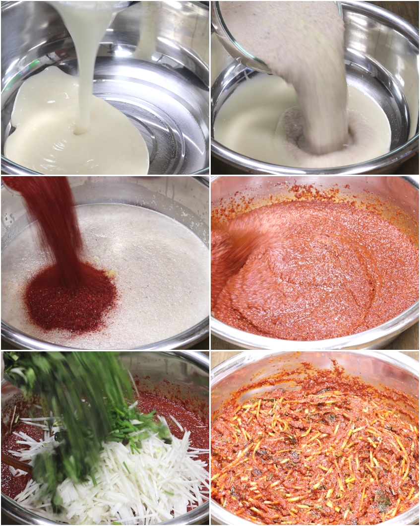 **믹서기에 갈은것에 양념할때: 식힌 찹쌀풀.다진마늘400g.다진생강100g.멸치액젓800g(700ml).고춧가루1100g.매실청4T.소금5T(56g/양념장에 소금은 버무린후 보신후 마지막에 기호에 맞게 넣기)