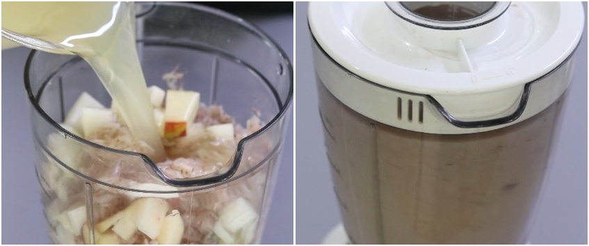 5. 배1/2개.사과1/2개.양파반개.대파흰부분3개.무500g 토막내어 믹서기에 넣고요