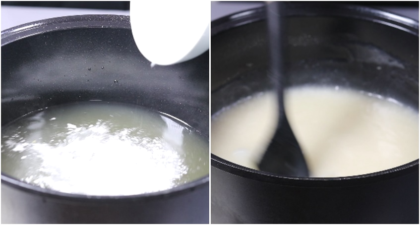 2. 찹쌀풀만들기 : 절임배추 오기전에 멸치다시마육수와 찹쌀풀은 미리 끓여서 식혀주는것이 좋습니다. 냄비에 멸치다시마육수1300g(1300ml). 찹쌀가루90g을 넣고 거품기로 풀어준후 중불에서 3~5분정도 저어주면서 끓여준후 완전히 식혀줍니다.