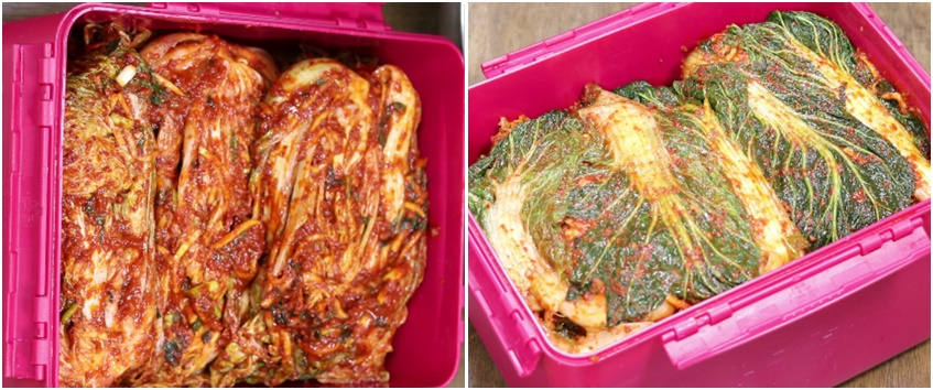 10. 버무린 김치를 김치통에 차곡차곡 담아준후 절인배추의 푸르고 억센겉잎 몇장만 떼어 양념장에 버무려 맨위에 덮어준후 밀봉하면 더 맛있게 숙성이 된답니다.또는 김장비닐을 김치통에 씌어준후 김치를 담아준후 밀봉해주셔도 됩니다.