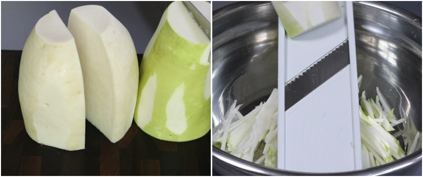 4. 무1개 큰사이즈(1600g) 세척후 반을 갈라준후 채썰어줍니다.