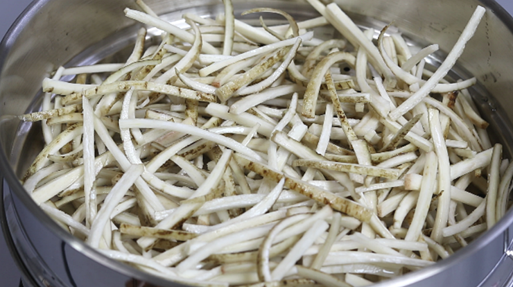 6. 찜기에서 찐 우엉을 한김 식혀줍니다.