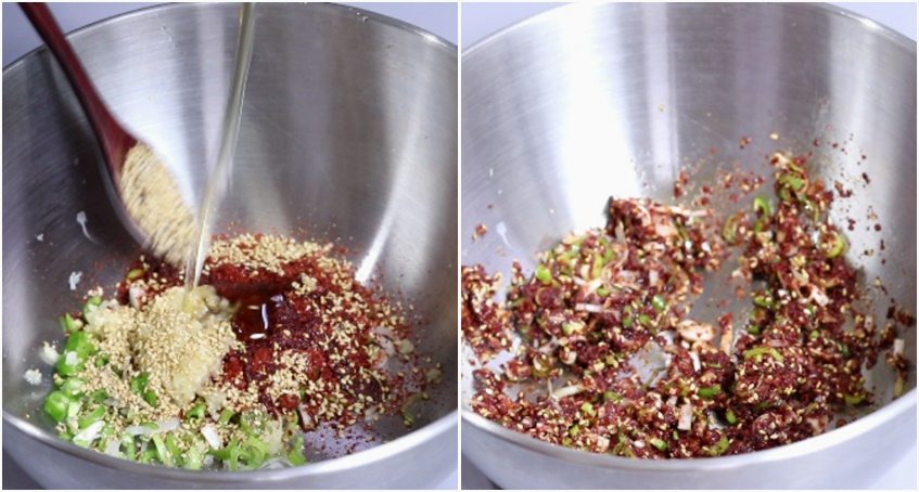 5. 그릇에 다진파3T.청양고추2개 총총 썰은거. 고춧가루3T반~4T.다진마늘1T.갈은깨1T.멸치액젓2T.간장2T.식초2T.알룰로스 또는 올리고당2T~2T반을 섞어 양념장 만들어줍니다.