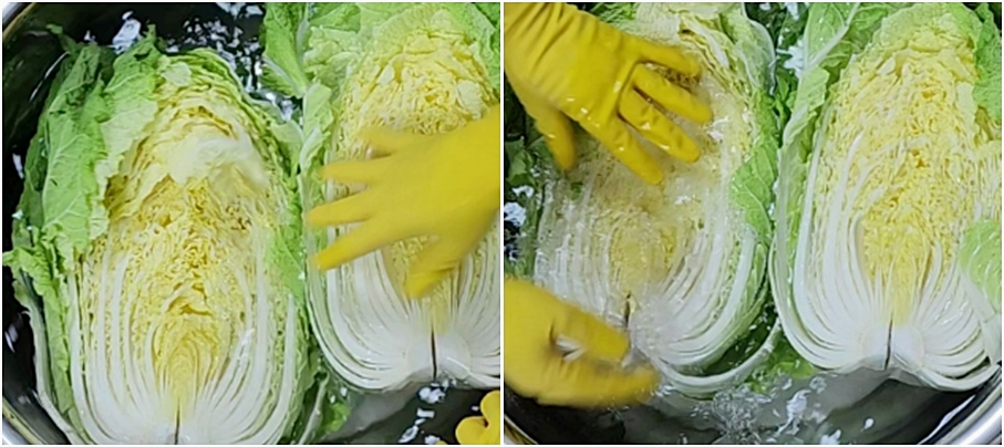 4. 준비한 1차 소금물에 배추를 5분정도 담궈 배추의 숨이 죽게 해줍니다.