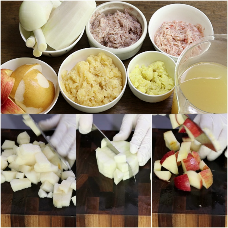 8. 배1/2개.사과1/2개.양파반개.대파흰부분3개.무600g 토막낸후 믹서기에 넣고요~