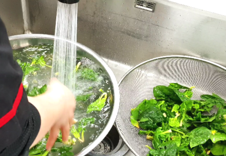 3.손질한 시금치를 세척후 체에 받쳐줍니다.