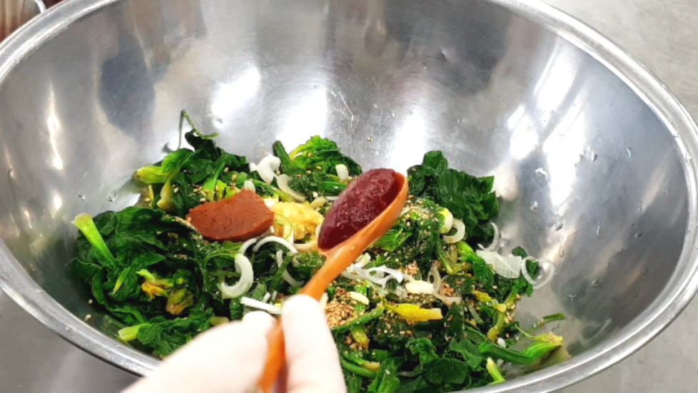 6. 다진마늘1/2T.다진파1T.참기름 또는 들기름1T반.국간장1T.된장1/2T.고추장1/2T.갈은깨1T반을 넣고 조물조물 무치면 완성입니다.