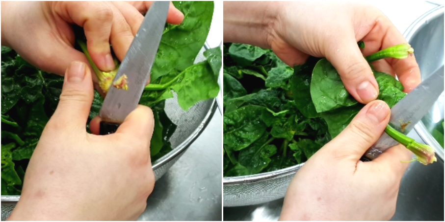 2. 시금치 뿌리부분에 더러운 부분이나 누런잎 제거하고 시금치가 길때는 반을 잘라줍니다.
