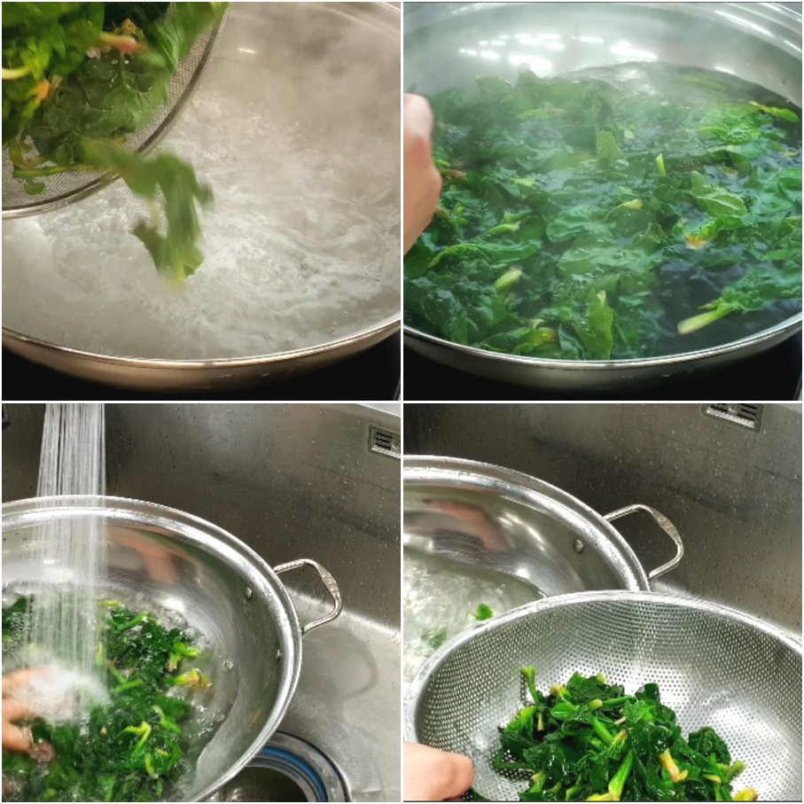4. 끓는물에 소금소량 넣은후 시금치를 넣고 한번 뒤적인후 넣다가 바로 빼는 느낌으로 살짝만 데친후 바로 찬물에 헹궈 체에 받쳐줍니다.