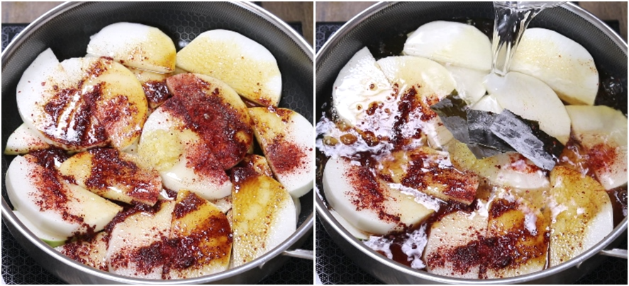 3. 냄비에 썰은 무를 넣고요~ 다진마늘1/2T.고춧가루1T.후춧가루소량.간장5~6T.멸치액젓1T.미림2T.알룰로스 또는 올리고당1T.감칠맛을 위해 다시마2~3조각을 넣고요 물1L를 넣어줍니다.