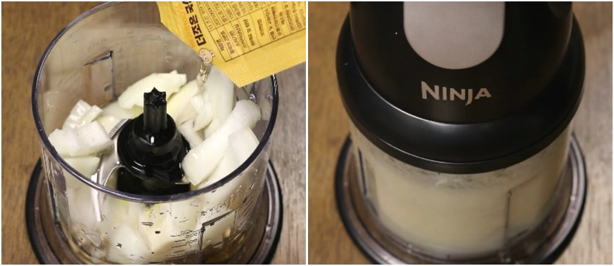 양파반개 토막낸후 믹서기에 넣고 배즙1봉지(100ml)를 넣고 갈아줍니다.