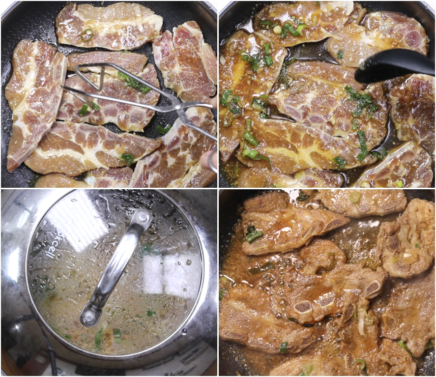 팬에 갈비를 넣고요~ 갈비가 들어간 만큼 갈비재운양념장을 나눠서 붓고 뚜껑은 덮고 중약불에서 끓으면 약불로 줄여 10분정도 구워준후 10분뒤 갈비를 뒤집어서 마저 10분정도 더 구워주면 됩니다.