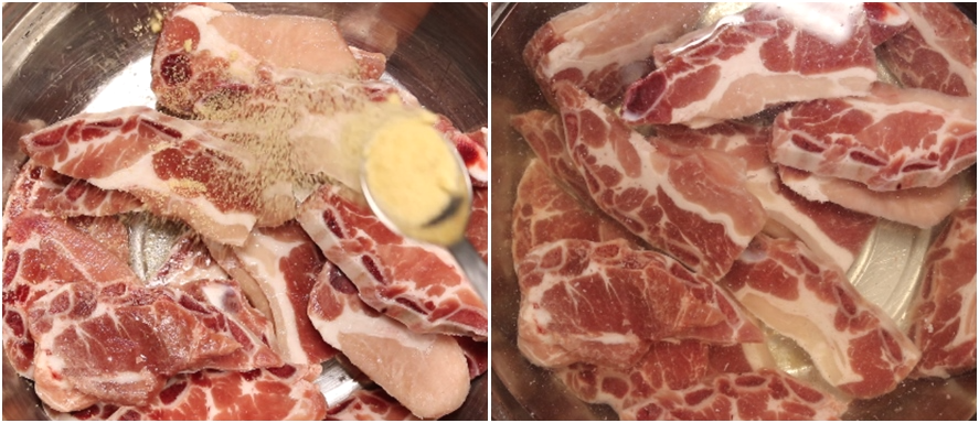 **돼지갈비 냉동된 것은 자연해동후 핏기를 뺄때 설탕을 넣고 빼주세요. 또는 콜라를 붓고 핏기를 빼도 연육작용에도 좋고 핏기가 잘 빠집니다.