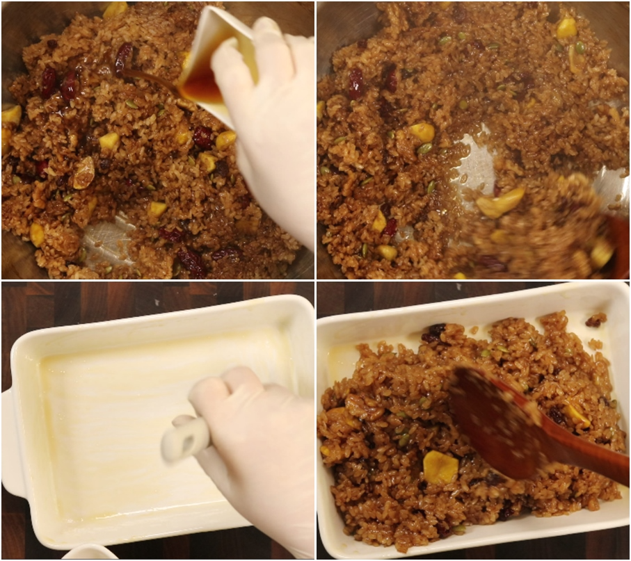 그릇에 참기름을 발라준후 뜨거운 약밥을 붓고 약밥이 식으면 먹기 좋게 썰어서 드시거나 랩을 이용해서 드실양만큼 랩으로 감싸서 모양을 잠아주셔도 됩니다.