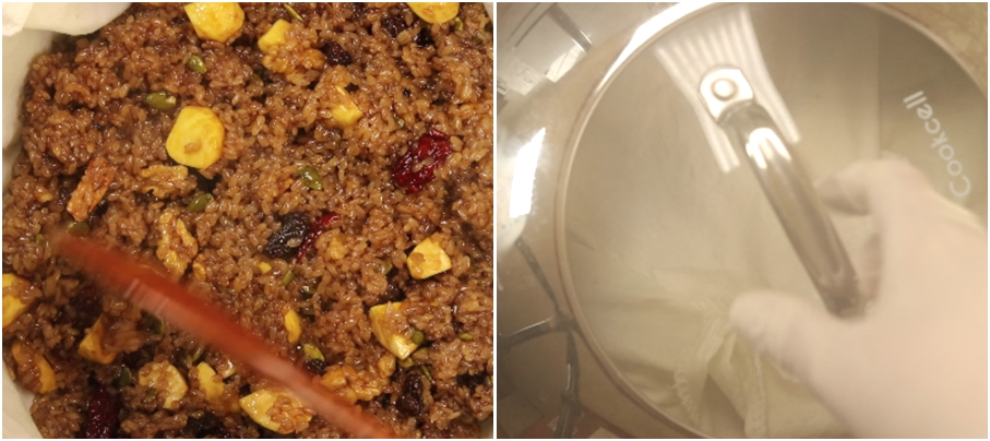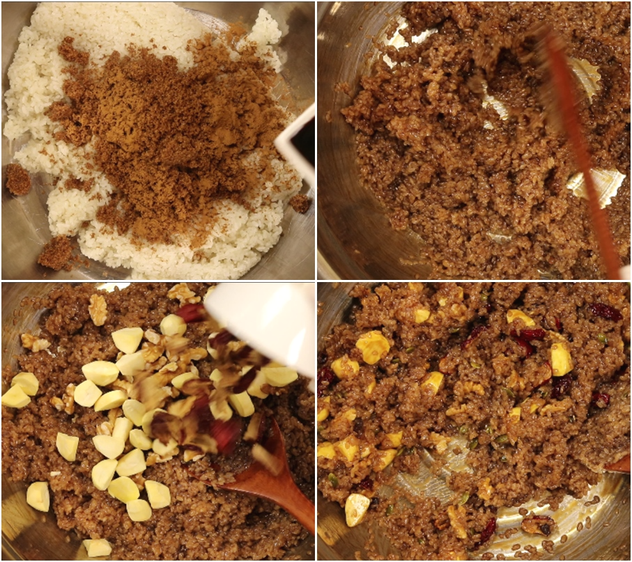 재료: 찹쌀500g(600ml /불리기전) . 밤15개.대추12개.호두40g.해바라기씨15g.건포도20g.흙설탕120g(200ml).계피가루1T.간장5T.참기름3T.꿀2T