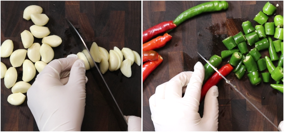 2. 무말랭이 불어나는 동안 마늘20개 저미고요 청양고추10개.홍고추5개는 토막내어줍니다.