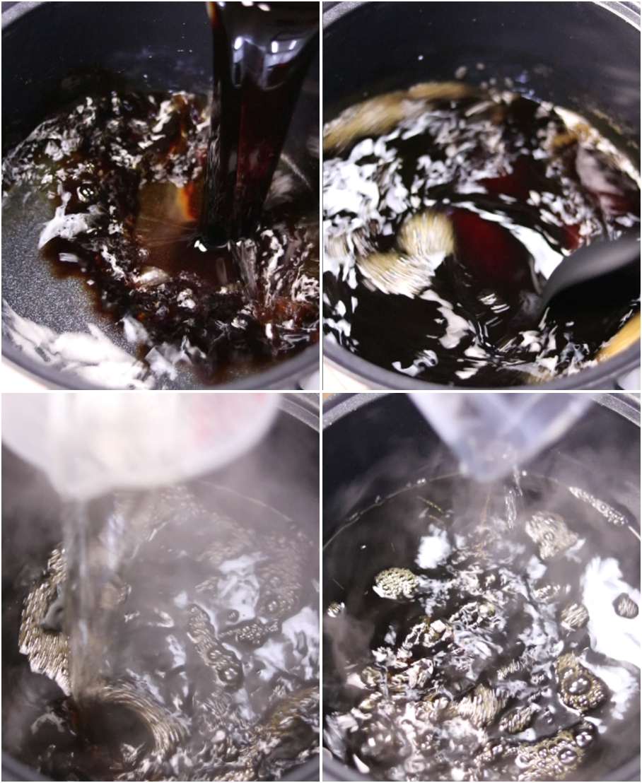 4. 냄비에 물400ml.간장400ml.설탕250ml를 넣고 센불로 켠후 저어주면서 끓어오르면 불을 끄시고 식초250ml와 소주50ml를 넣고 뒤적여줍니다. 식초는 이렇게 마지막에 넣어야 식초향이 날라가지 않습니다.
