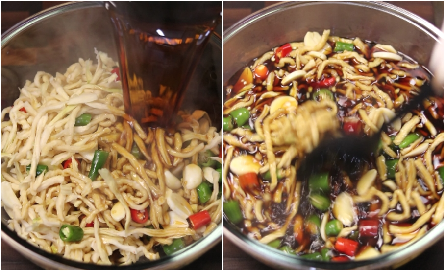 5. 간장물이 뜨거울때 바로 무말랭이에 골고루 부어준후 주걱으로 저어준후 상온에서 완전히 식었을때 반찬통에 담아 냉장고에 넣고 드시면 됩니다.