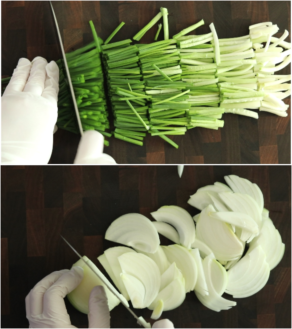 9. 고명으로 들어갈 쪽파한줌(100g) 세척해서 3cm길이로 썰고 양파1개 곱게 채썰어줍니다.