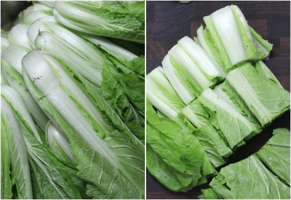 3. 얼갈이는 밑둥부분 제거하고 긴것은 3등분 작은것은 2등분해줍니다.