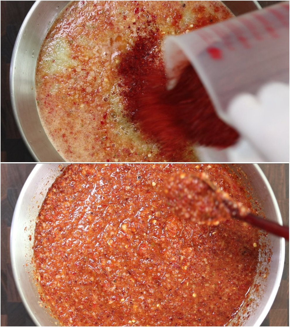 *믹서기에 토막낸후 양념장 만들때 : 홍고추300g(16개).청양고추40g(6개). 양파1개. 마늘100g(5T).새우젓3T.찬밥1공기듬쁙(210g).멸치다시마육수600ml(또는 찬물). 멸치액젓150ml.매실청5T.소금2T.고춧가루300ml.