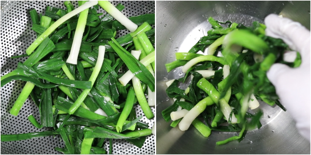 6. 데친 풋마늘의 물기를 손으로 눌러 짠후 그릇에 담아주는데요~ 흰부분이 좀 길면 더 잘라주셔도 됩니다.
