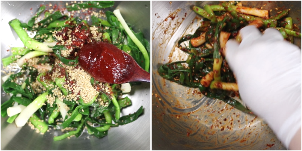 재료(2~4인분):풋마늘230g(뿌리제거하고 겉잎과 누런잎 제거후 무게). 고춧가루1T.고추장1T.매실청1T~1T반(또는 올리고당).멸치액젓1T반.참기름 또는 들기름1T. 갈은깨1T.