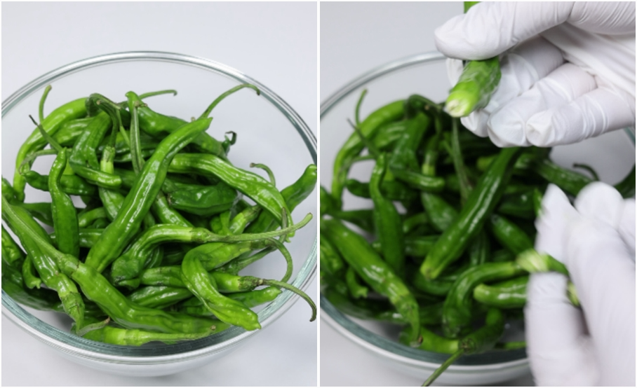 **꽈리고추의 꼭지를 떼어낼때 고추가 상처나지 않게 살살 제거해주세요.