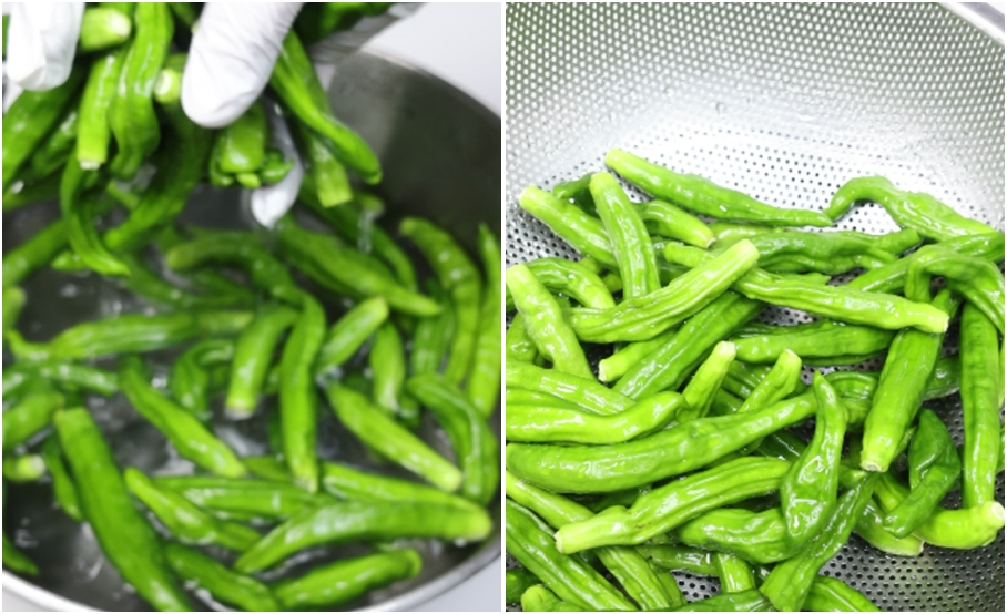 2. 손질한 고추는 세척후 체에 받쳐 물기를 탁탁 털어줍니다.