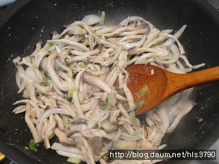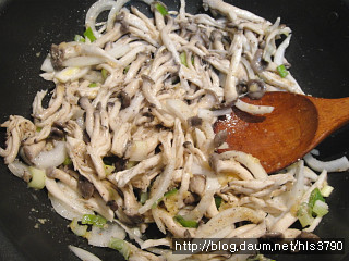 찬물에 헹군뒤 물기를 너무 빼주지 마시고...바로 볶음팬에 넣어줍니다..버섯에 있는 물기로 볶을겁니다...