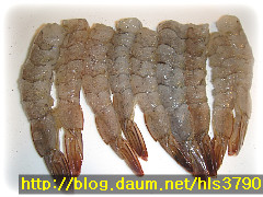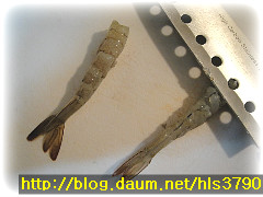1. 새우의 머리를 제거하고...새우의 껍질을 마지막꼬랑지부분 한마디만 남기고
