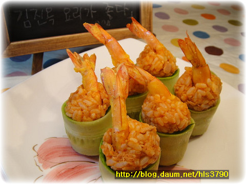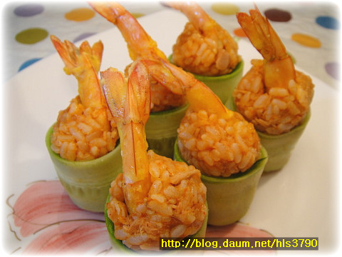 오이를 깔고 비벼놓은 밥에 새우전을 넣고 돌돌말아주시면 완성입니다~~