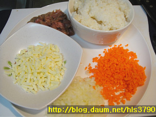 재료: 찬밥1공기. 돼지고기 갈은거 한주먹. 양파1/2개. 당근조금. 피자치즈가루. 소금. 식용유.