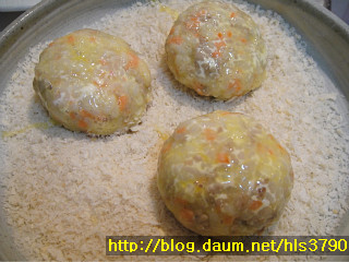 3. 동글랗게 만든 반죽을 밀가루-> 계란 풀어 놓은 계란물 -> 빵가루를 입혀주세요...