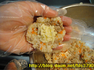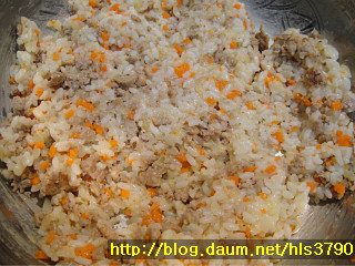 볼에 찬밥+볶은 돼지고기+볶은 양파+볶은당근을 넣고 참기름1/2T와 고운소금1/3T를 넣고 반죽을 골고루