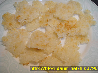 후라이팬에 식용유를 넉넉히 두른후 누룽지를 튀겨줍니다... 튀긴후 설탕을 뿌려주면 완성입니다~~