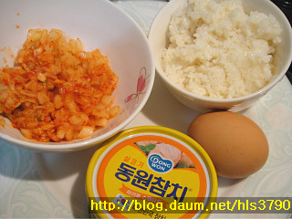 재료: 찬밥1공기. 참치1캔. 익은배추김치2장. 계란1개.식용유