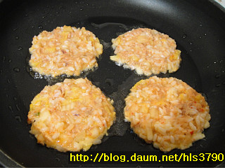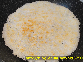 후라이팬에 닿은 밥이 누룽지로 변해있지요?? 한쪽면이 누룽지로 변하면 다른면을 뒤집어 10분정도 또 약불로