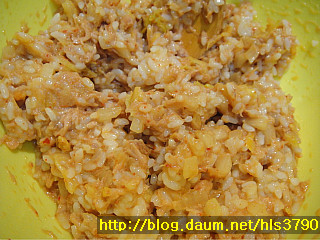 볼에 찬밥1공기와 김치와 참치캔과 계란1개를 넣고 골고루 섞어줍니다..반죽이 질면 찬밥을 더 넣어주시고요..